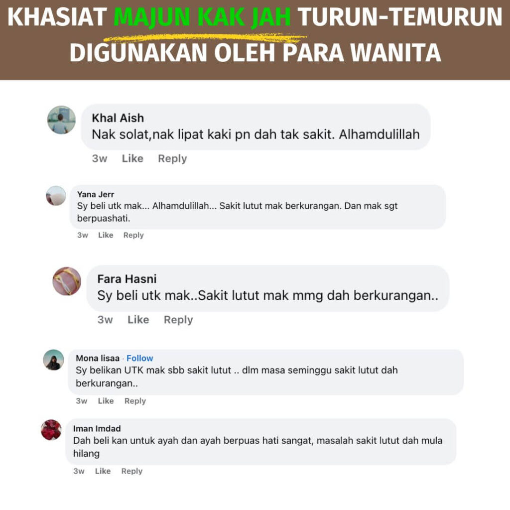 KETIGA:Kak Jah bantu puan sehingga puan berjaya selesaikan masalah sakit lutut dan pinggang dengan penggunaan sekurangnya 2 botol. Sekiranya kak jah tak berjaya bantu, majun kak jah tak mendatangkan hasil, kak jah akan berikan JAMINAN WANG DIKEMBALIKAN PENUH.